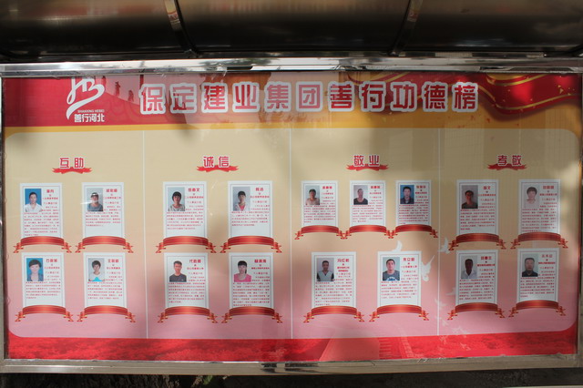 善行功德榜分為“互助、誠(chéng)信、敬業(yè)、孝敬”四個(gè)方面,共計(jì)展示了道德模范17人,全部由分公司一線員工組成,他們勤勤懇懇、兢兢業(yè)業(yè),在平凡的工作崗位上創(chuàng)造了不平凡的業(yè)績(jī)。